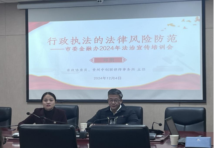 2024年12月4日是我国第十一个“国家宪法日”,贵州中创联律师事务所所主任邱刚、执业律师余微到贵阳市委金融办与该办干部职工共同深入学习贯彻习近平法治思想,宣讲新修订的《中华人民共和国行政处罚法》、“行政执法的法律风险防范”主题培训。