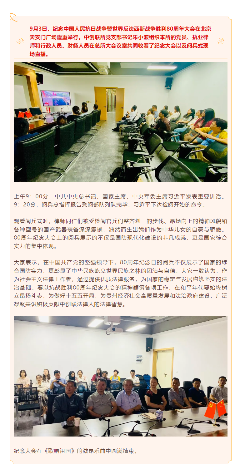 铭记历史,开创未来:贵州中创联律师事务所组织收看抗战胜利80周年纪念大会